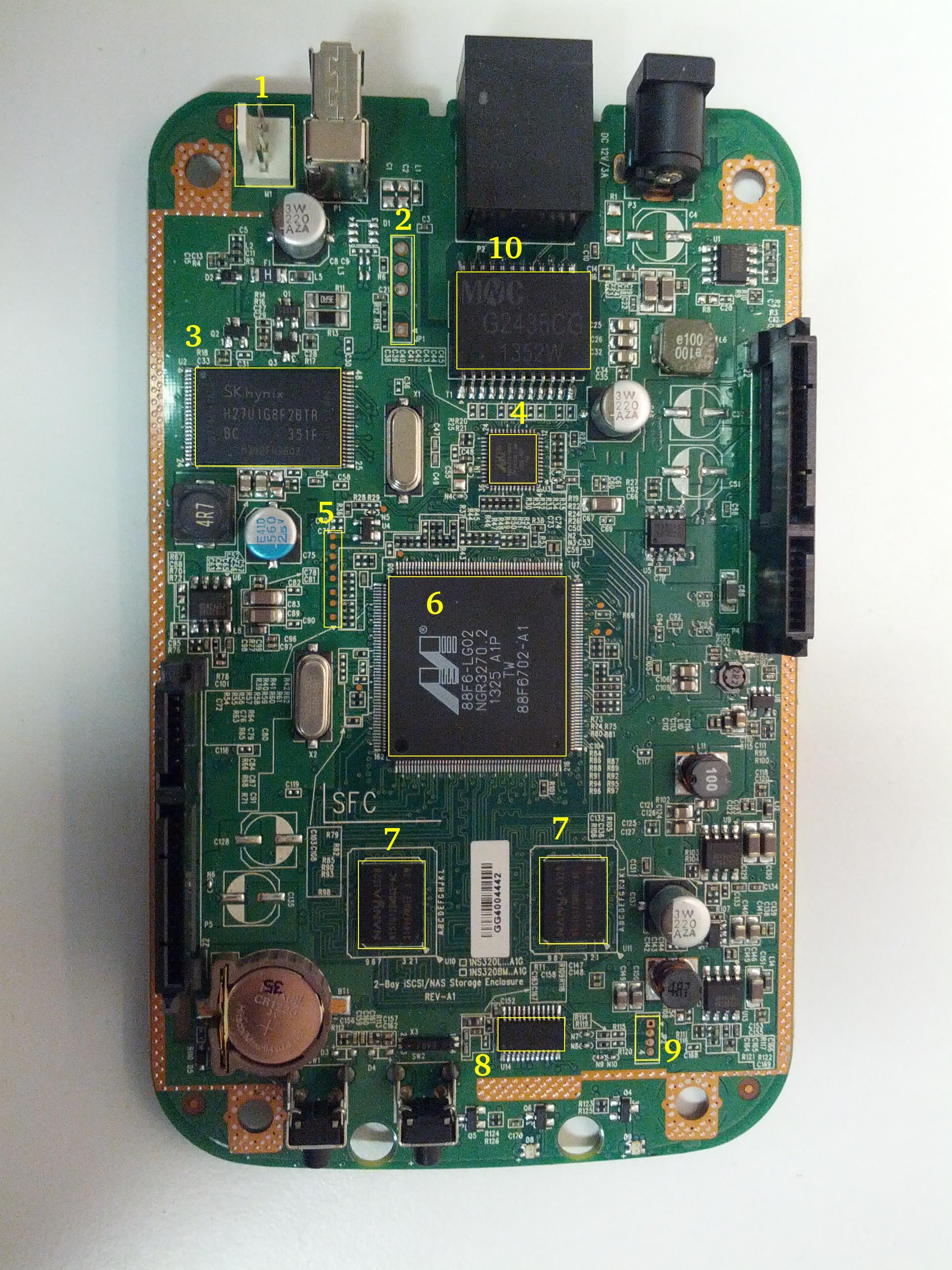 The system is based on a Marvell Kirkwood 1GHz SOC, other chips include an Ethernet controller, flash, RAM as well as an MCU which is a systems management controller similar to what you would have in a laptop or PC. The NAS has it's page on both deviwiki and new wikidevi where detailed information about the chips on the board can be found. Different devices based on the 88F6702 SoC used are: