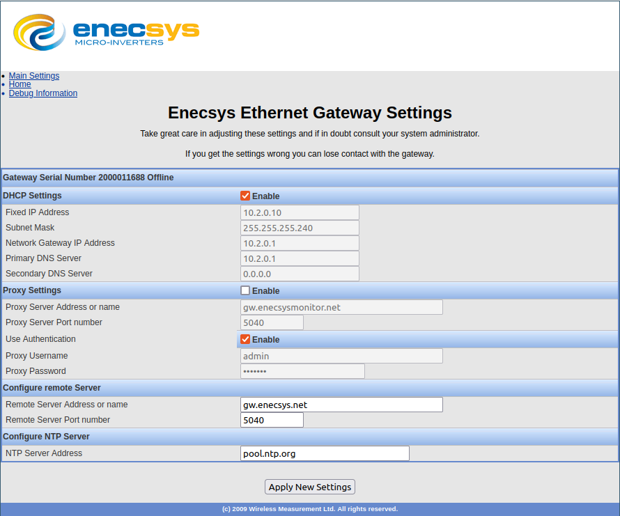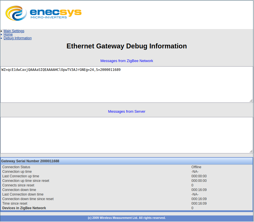 The Enecsys Gateway is a Zigbee gateway allowing communications between the Enecsys microinverters and their monitoring backend. The Enecsys company is unfortunately defunct since 2015 and their DNS domains have been taken over by a UK enecsys owner who created his own monitoring system on https://enecsys-monitoring.com/