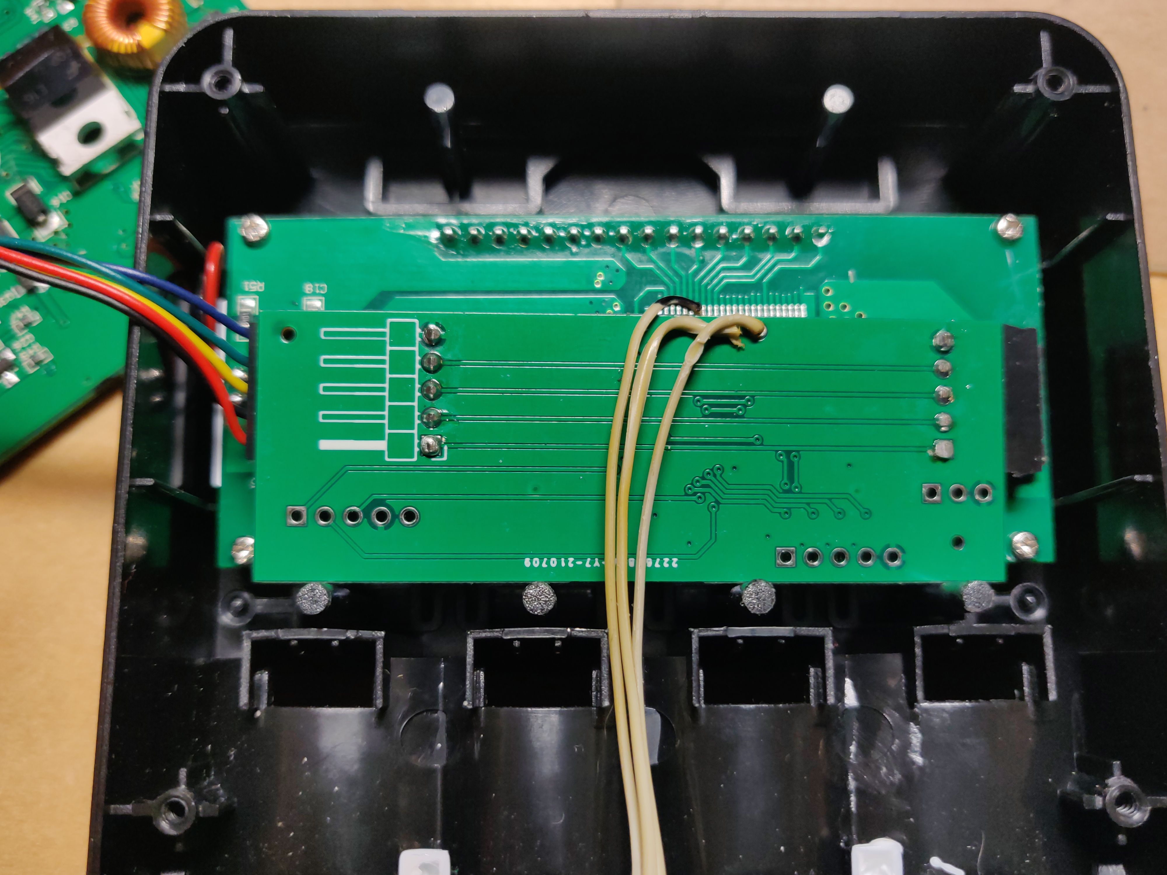 The next order of business was to somehow bring out the LCD wires from outside of the charger enclosure neatly in order to connect them to whatever will be snffing the traffic. For this purpose a small breadboard has been used together with three 2.54 mm angled headers. All of this fits neatly at the back of the LCD module with the external wire running down the middle and out of a air vent in the case:
