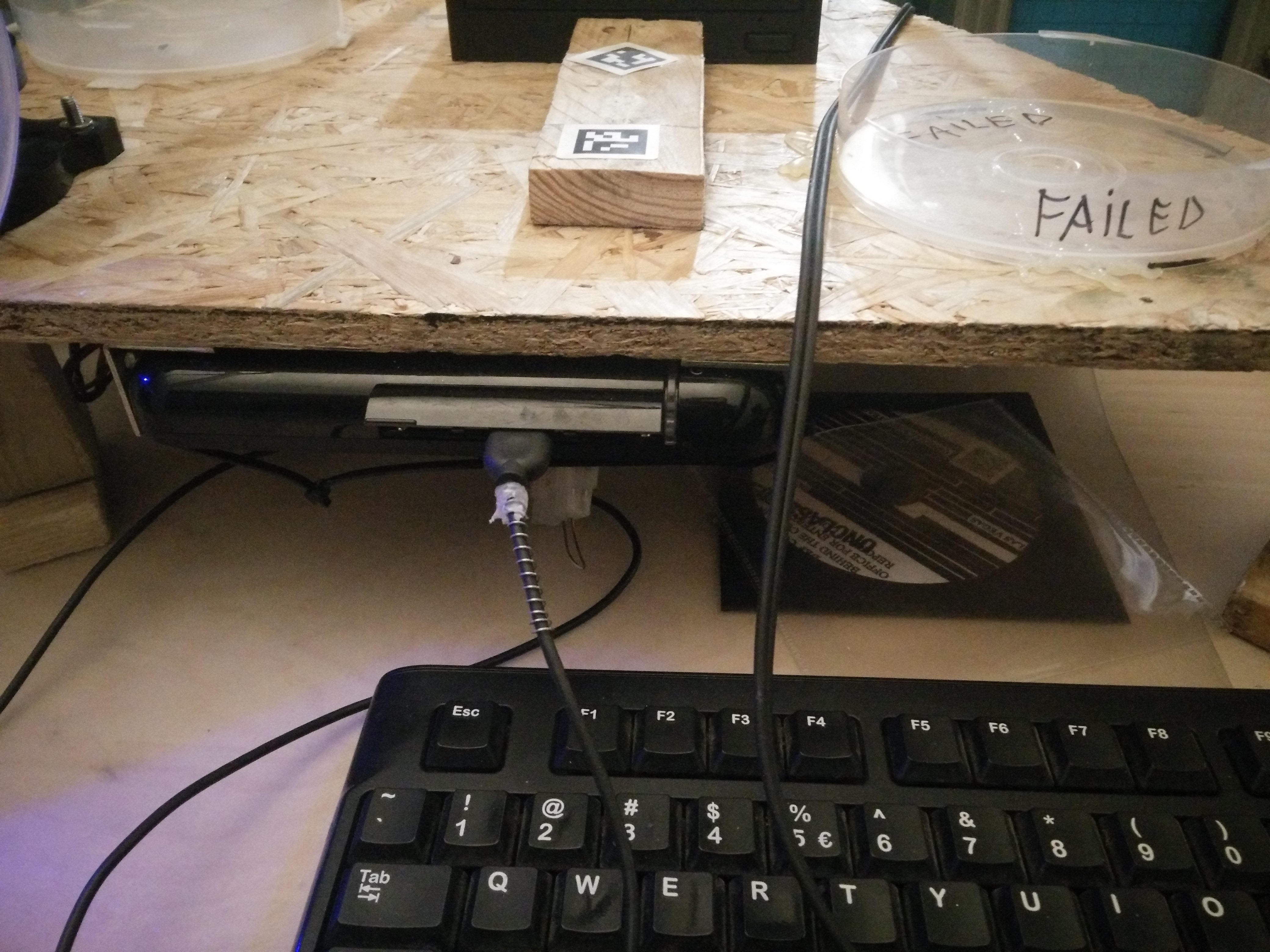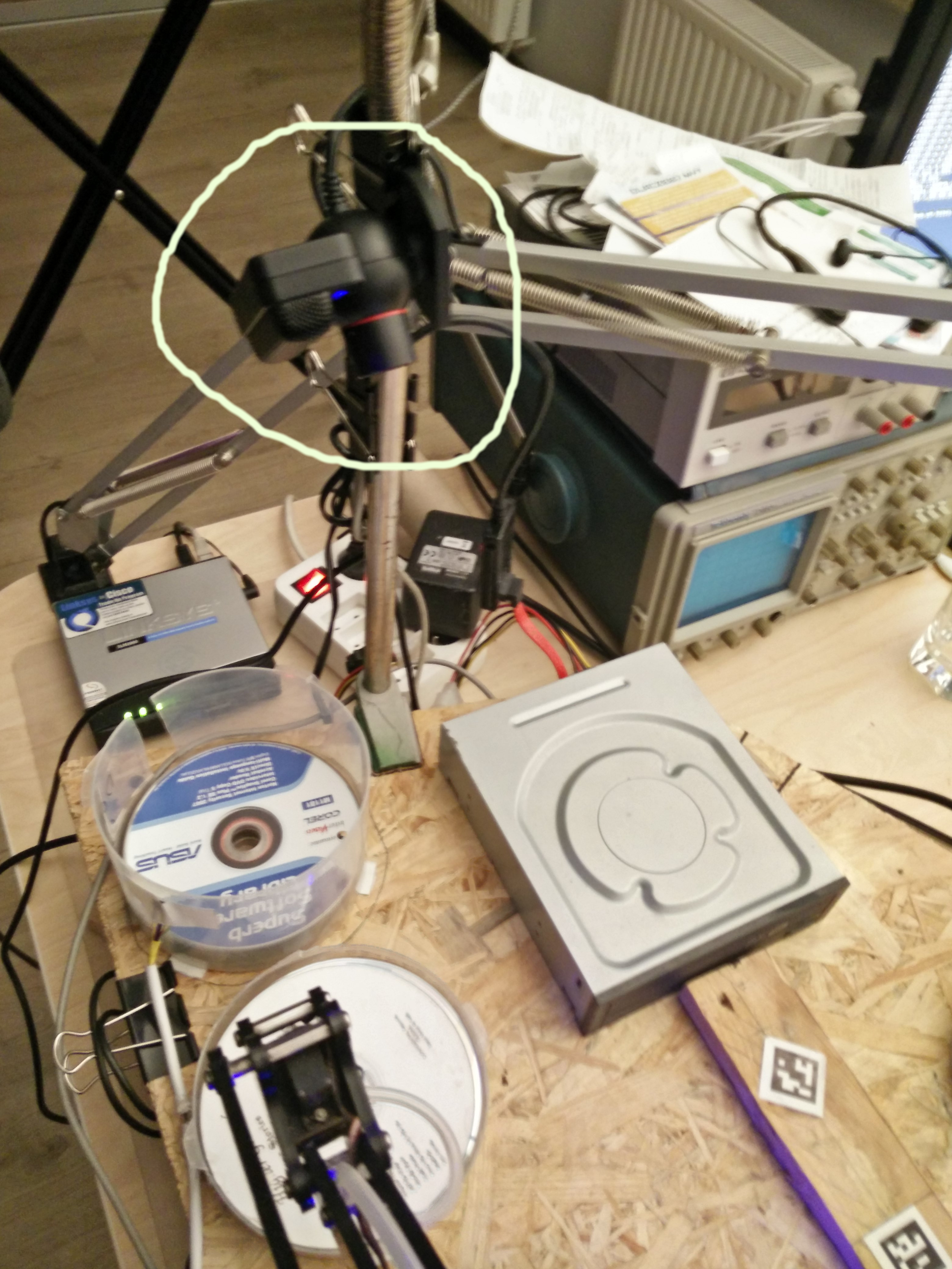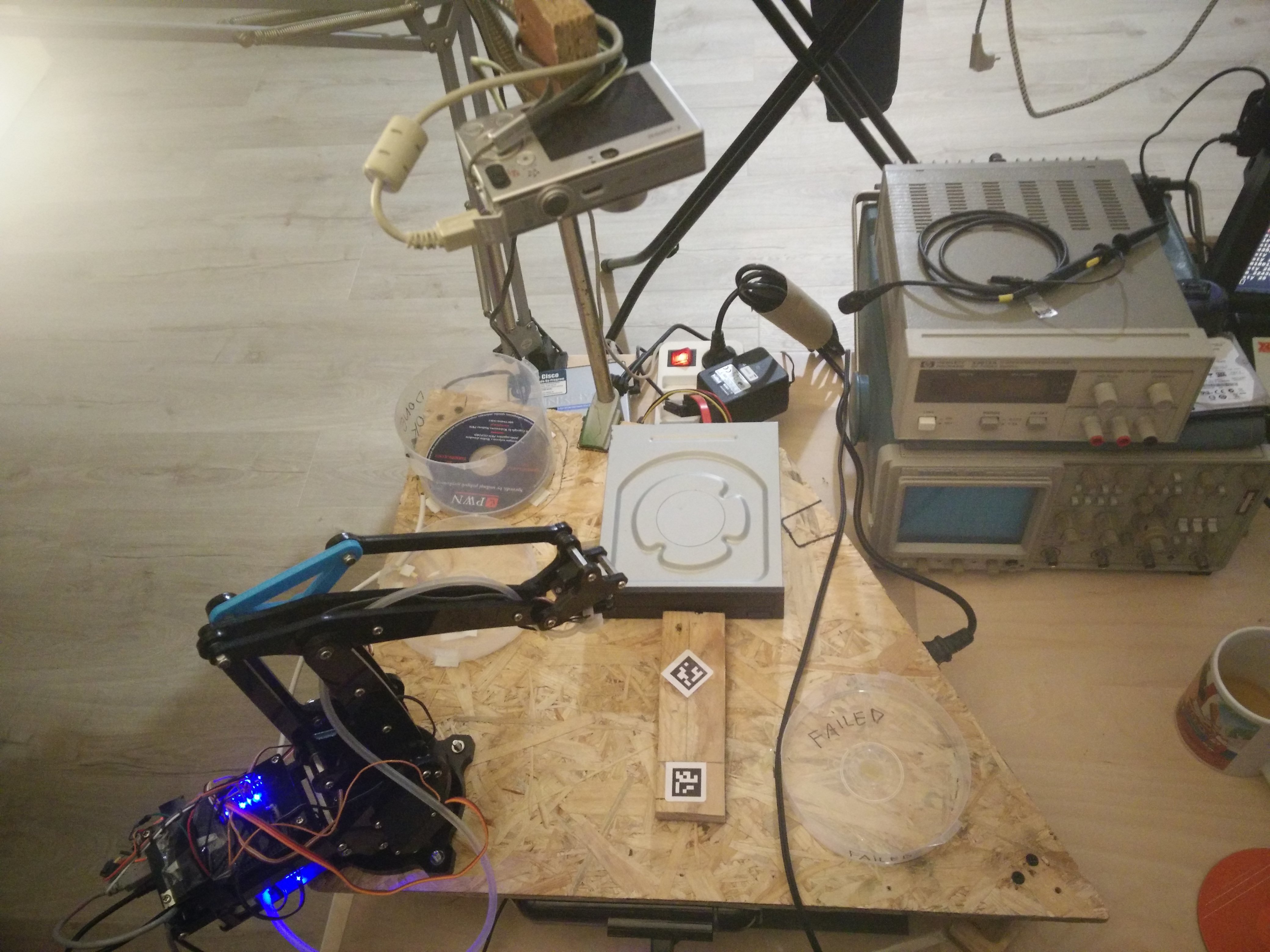 Even though the place in which the user needs to attach the vision subsystem to the base board is clearly marked, the robot uses a simple automatic calibration procedure to detect where exactly the camera is pointing at. To achieve this a pair of ARuCO markers was printed and put on the working plane. One is situated on where the center of the disc is located when the drive tray opens, the other one is on the edge of the tray. Both are used to calculate the position of the disc cover on the image as well as it's diameter.