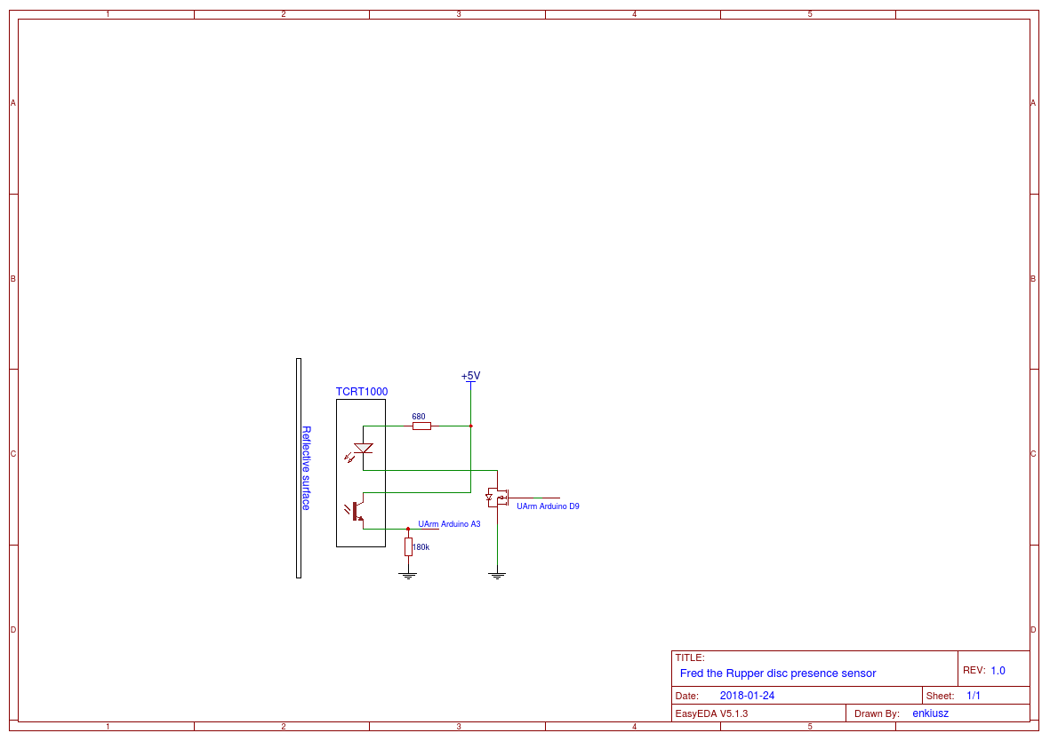 The UArm I used was perfect for the task as it had a vacuum pump and suction cup which made it possible to easily grab and manipulate big flat items :). Because the arm is the only place where I have digital output GPIOs and ADC inputs available, this is where I decided to connect the disc presence sensor circuits. These allow the robot to know if there are any more discs to archive or if the destination tray is full. This task is achieved thanks to TCRT1000 reflective optical sensors and as CDs are pretty reflective this works rather well :). The connection schematics for a single sensor are show below: