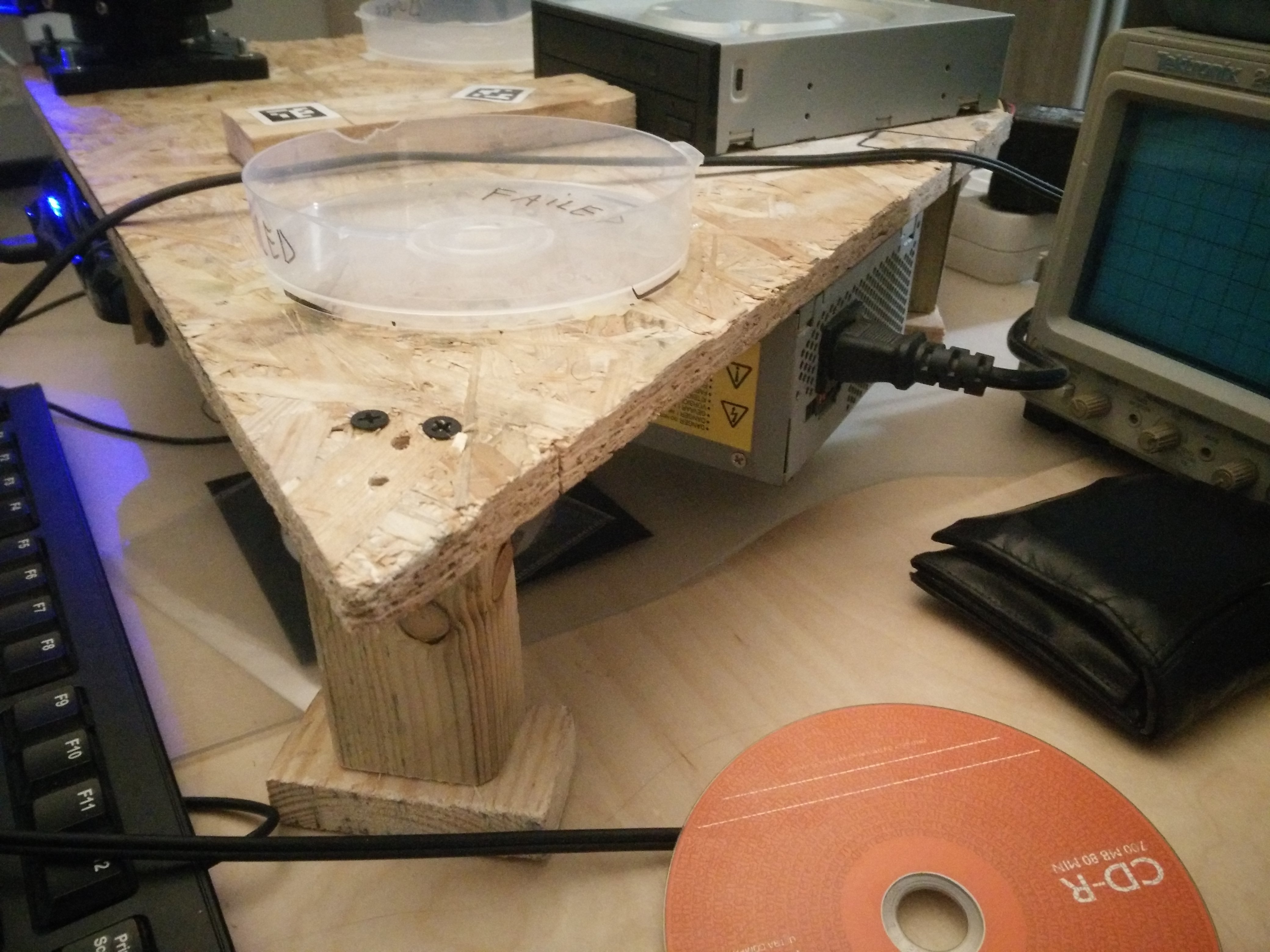 The drive subsystem uses an Sony Optiarc DVD RW AD-5260S drive connected with a JMicron JM20337 SATA<->USB bridge to the controller PC. The type of drive used is the limiting factor when it comes to the types of discs that can be archive using FtR. It can't read Bluerays for example. One pesky bug that I found in the JM20337 bridge is that it takes it a while (usually around 30 seconds) to realize that the drive is connected and power has been detected. I'm not sure if this is something caused by the logic in the bridge itself or is the drive sluggish to bring up it's SATA link for example.
