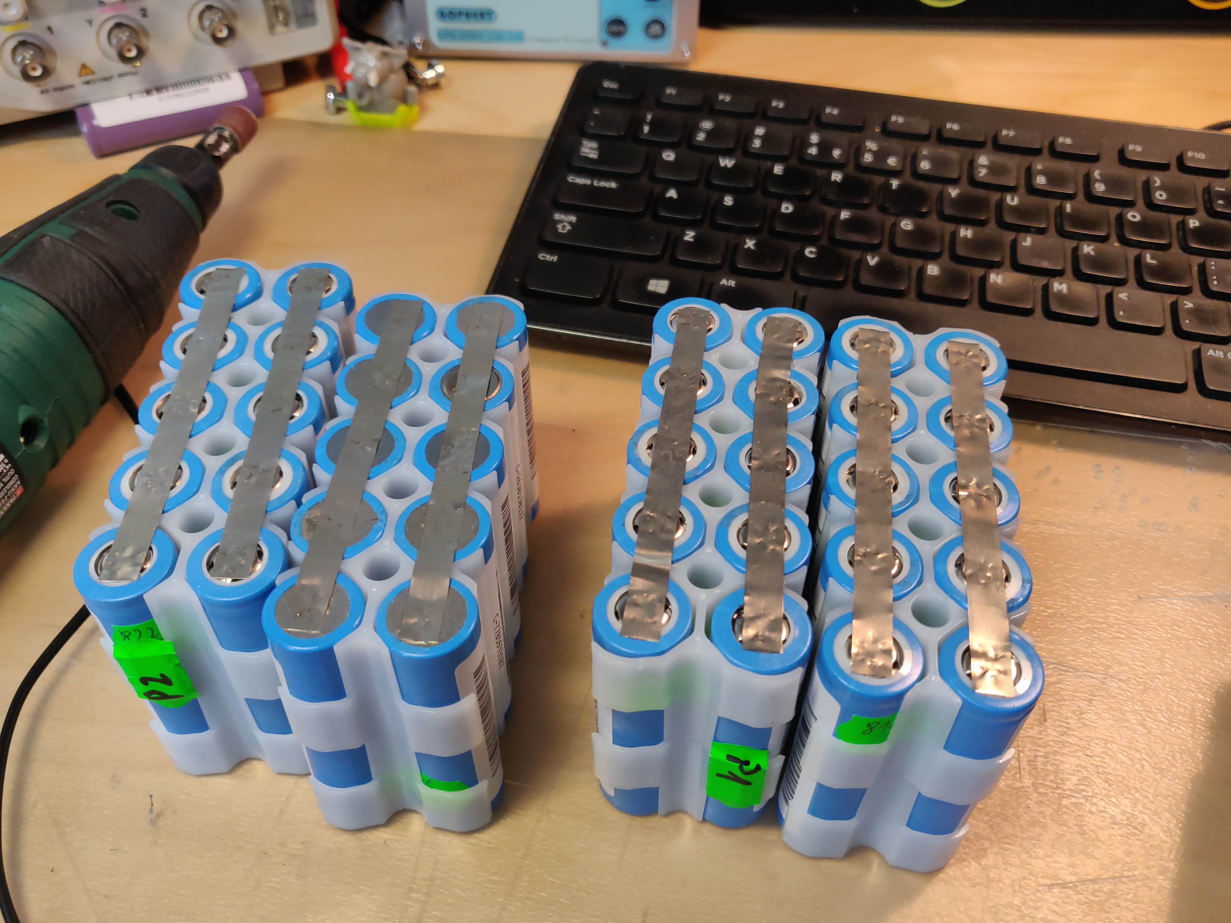 The cells themselves were mounted in plastic cages recovered from the disassembled hoverboard battery packs. This type of cages are not the only ones that can be used, you could also use very popular DIY holders with brackets that can be assembled together in many shapes: https://www.aliexpress.com/item/32871111193.html. The cells were welded together with a spot welder using a 0.1 mm nickel strip, first the rows of the cells: