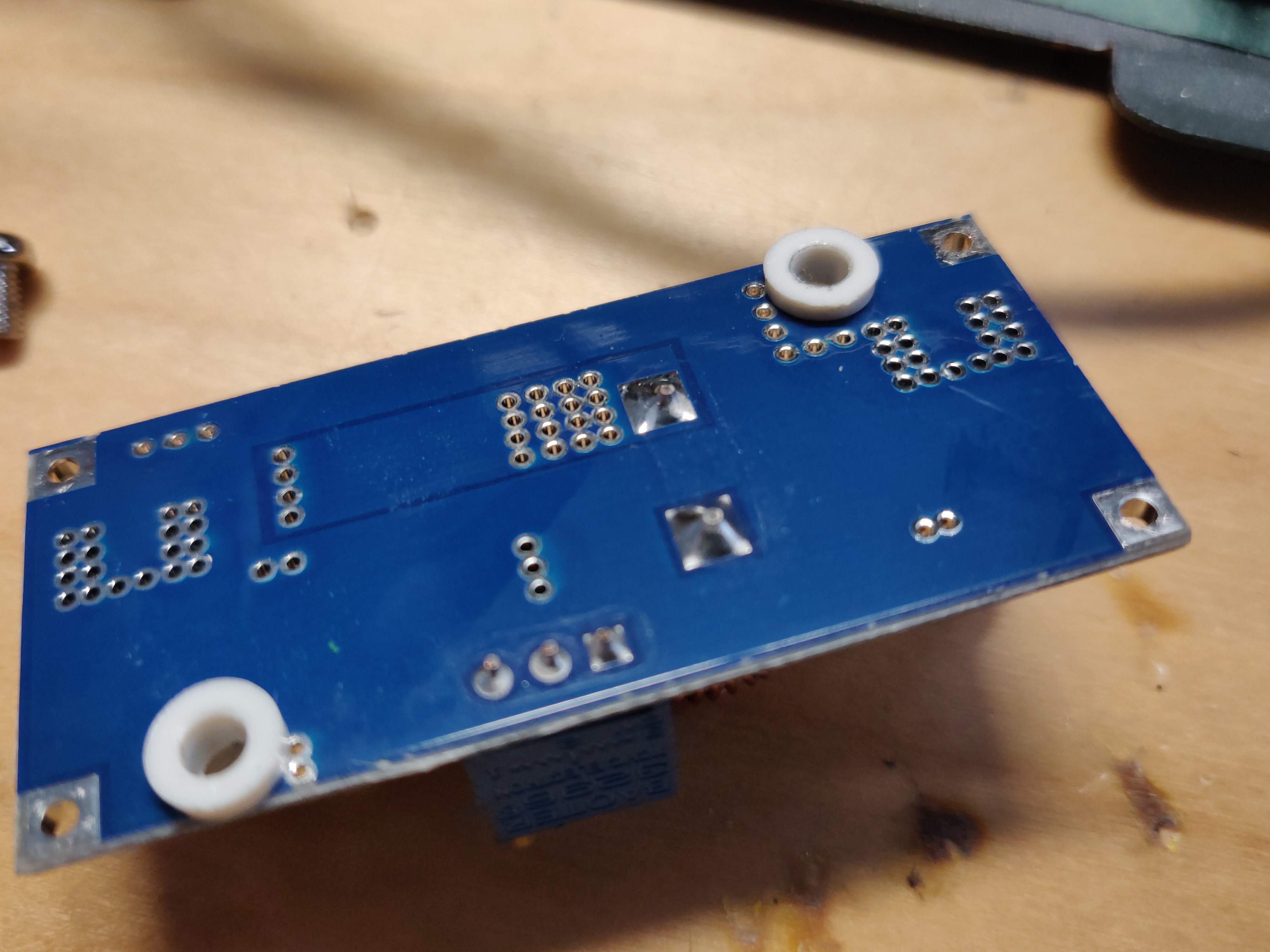 I have found out however, that the LM1596 isn't capable enough to reliably power all of the 5V loads (a Raspberry Pi + a fan in the rack in my case). Therefore I decided to replace the LM2596 with another XL4015 board adjusted to provide 5.1V just in case to account for voltage drops on shitty wires. During the mounting of both boards I had to provide some distancing between the top and the bottom one as the bottom inductor was touching some solder joints on the top board. I used here small M3 screws with plastic insulating distance rings which were originally holding MOSFETs to a heatsink in a power supply. I knew they would come in handy some day ;)