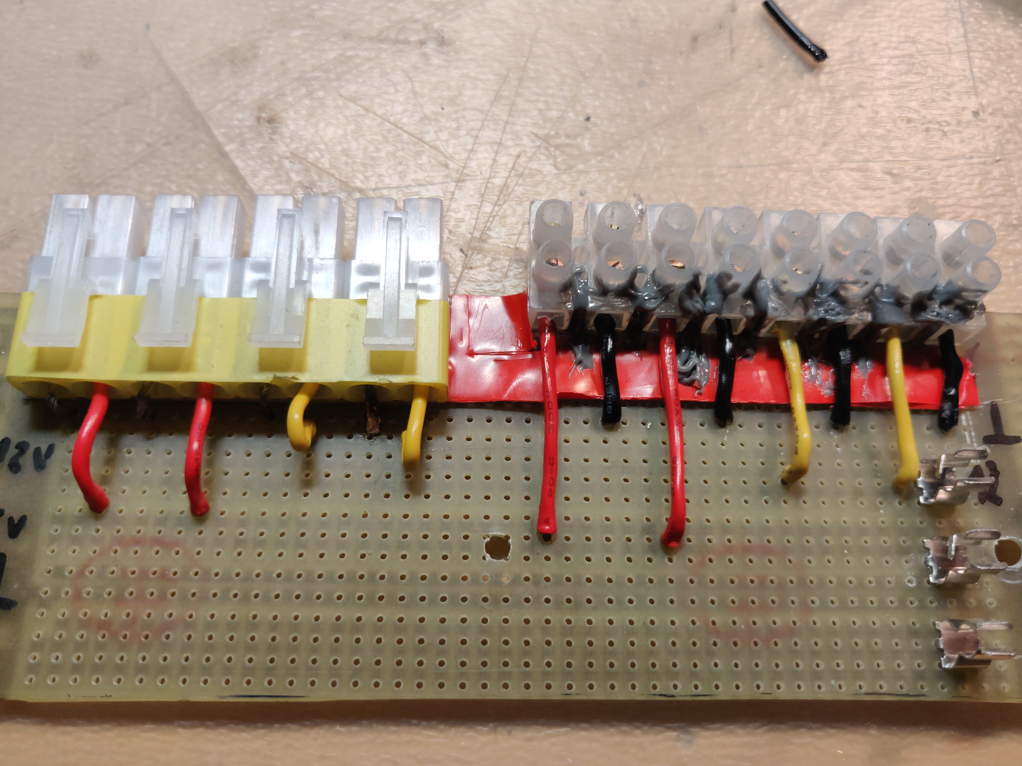 The screw terminals were additionally fixed with epoxy glue as the surface holding onto the doublesided tape was too small to ensure a good grip. After the connectors were mounted they were soldered to 12V (yellow wires) and 5V (red wires) power rails and a common ground rail.