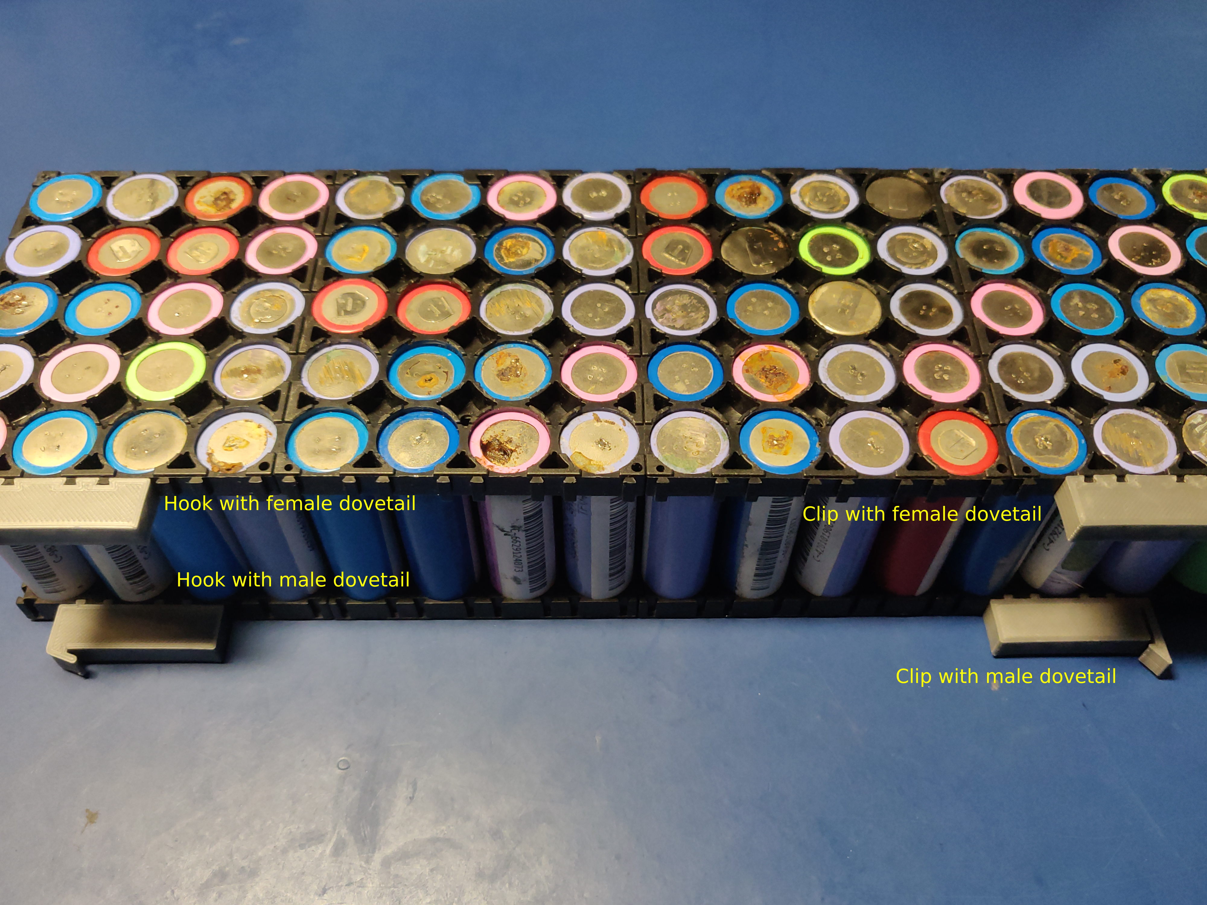 The brackets are designed to mate with the dovetails with popular 20.2 mm pitch 18650 cell spacers.
